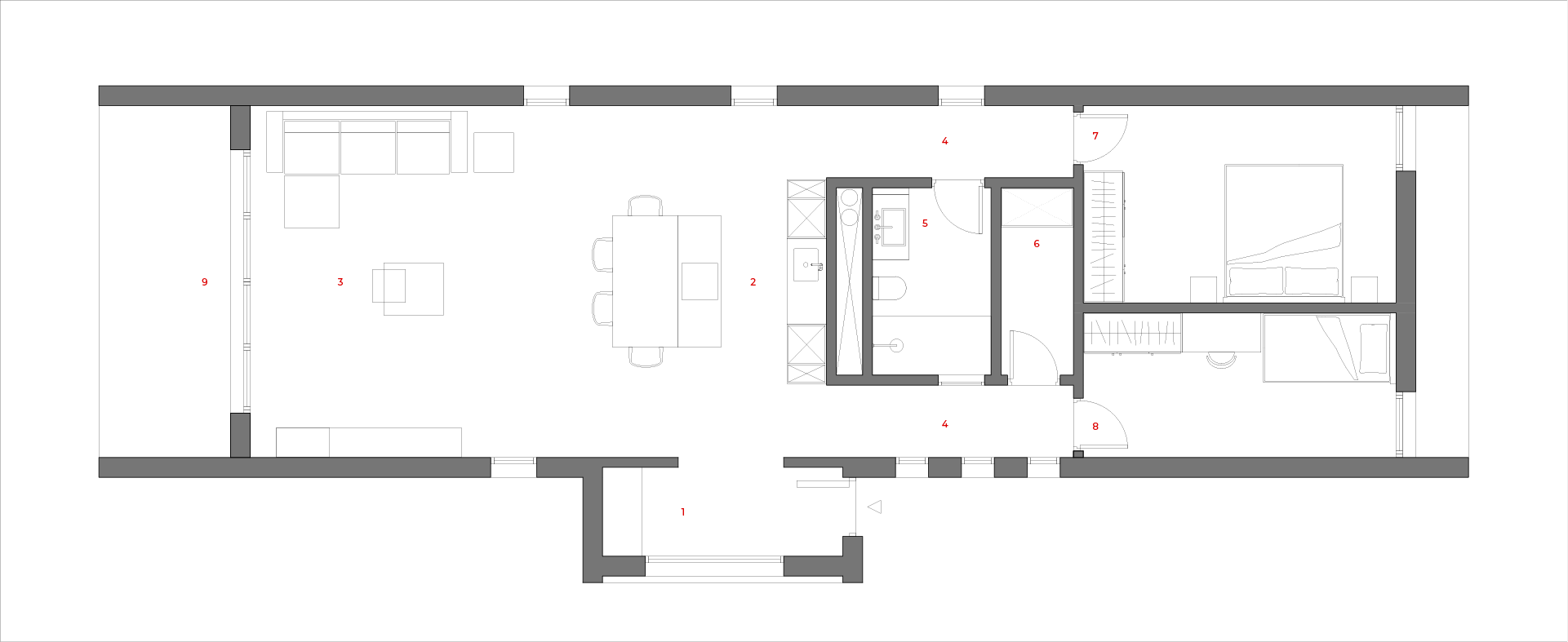 Esta distribución longitudinal de espacios permite una disposición simétrica de las estancias, lo que posibilita una fácil circulación al interior de la vivienda y la entrada de luz natural a todas las estancias de la misma. El acceso a la vivienda se produce por la zona Sureste.