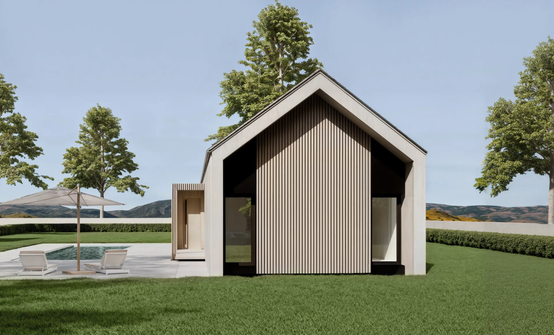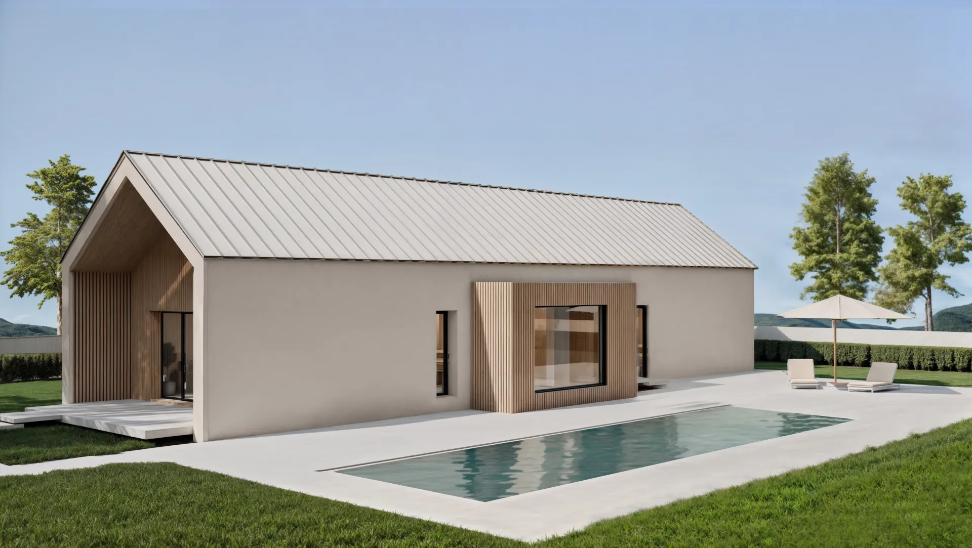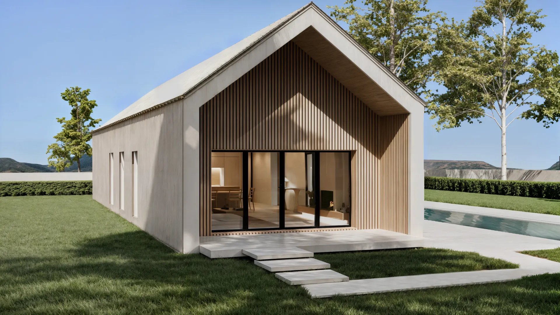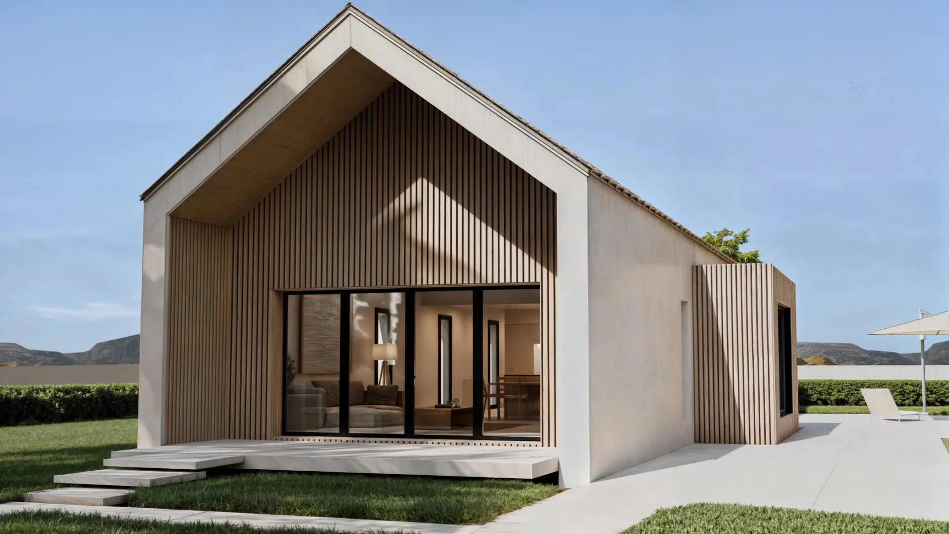 En el exterior, se ha proyectado una acera perimetral con un acabado superficial en hormigón impreso gris claro mate y efecto madera.